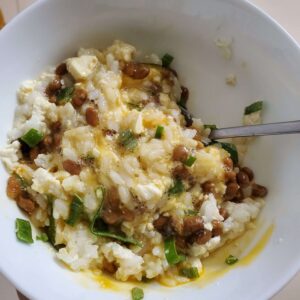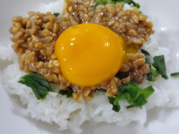 Entonces, cada vez que tengo la oportunidad de comer natto, lo disfruto con huevo crudo.