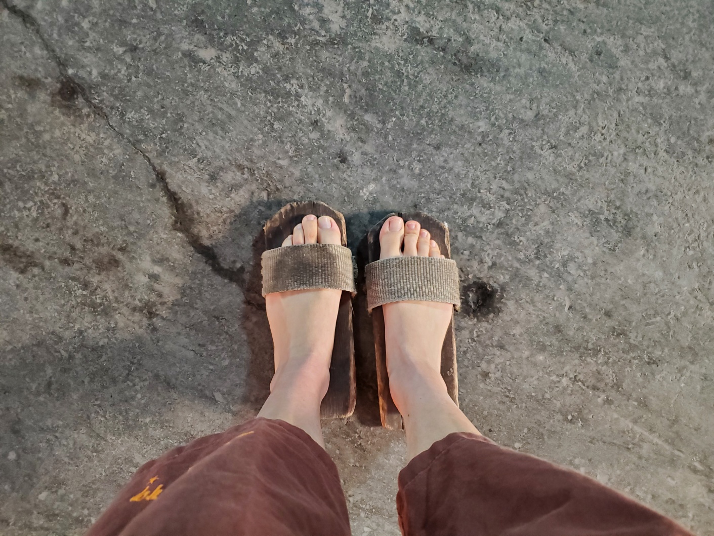 Debes usar unas sandalias que Son de madera, estas sandalias Son muy antiguas incluso al caminar hacen sonido, es divertido usarlas, pero después de un rato se sienten un poco incómodas.